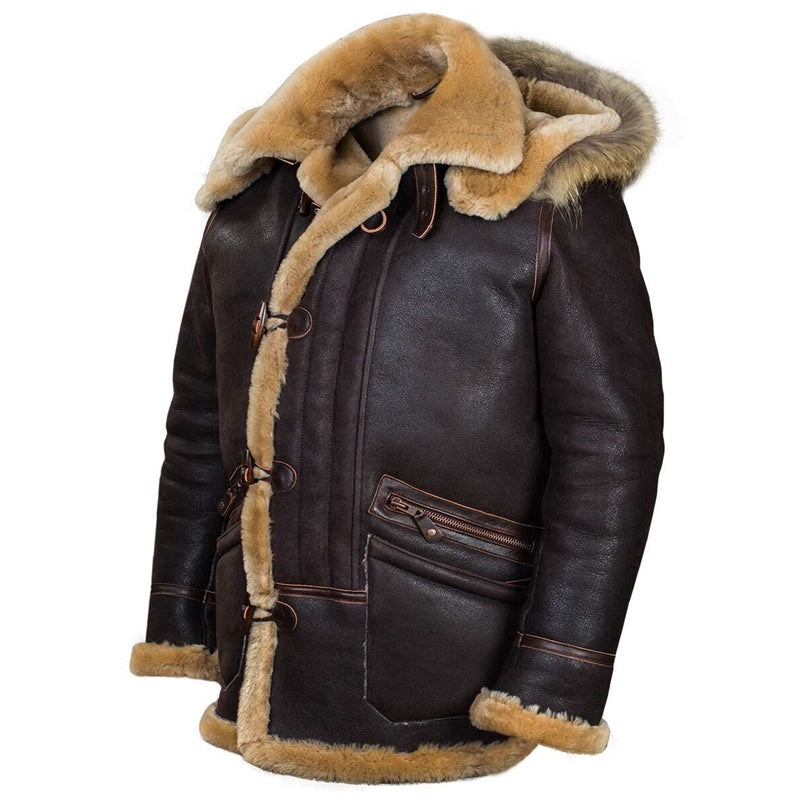 Hatmeo Men's Fur Coat Sheepskin Bomber Jacket with Hood