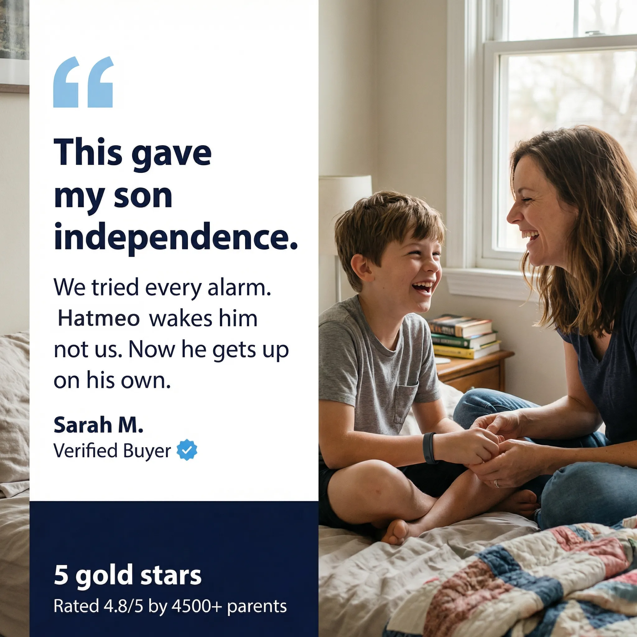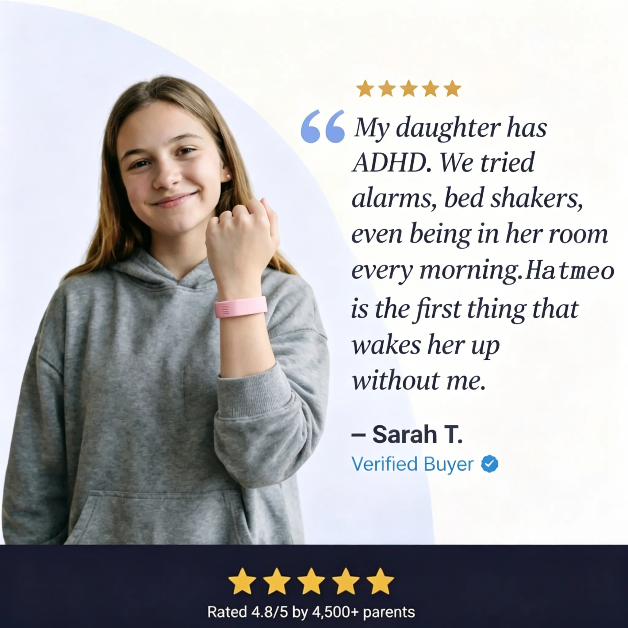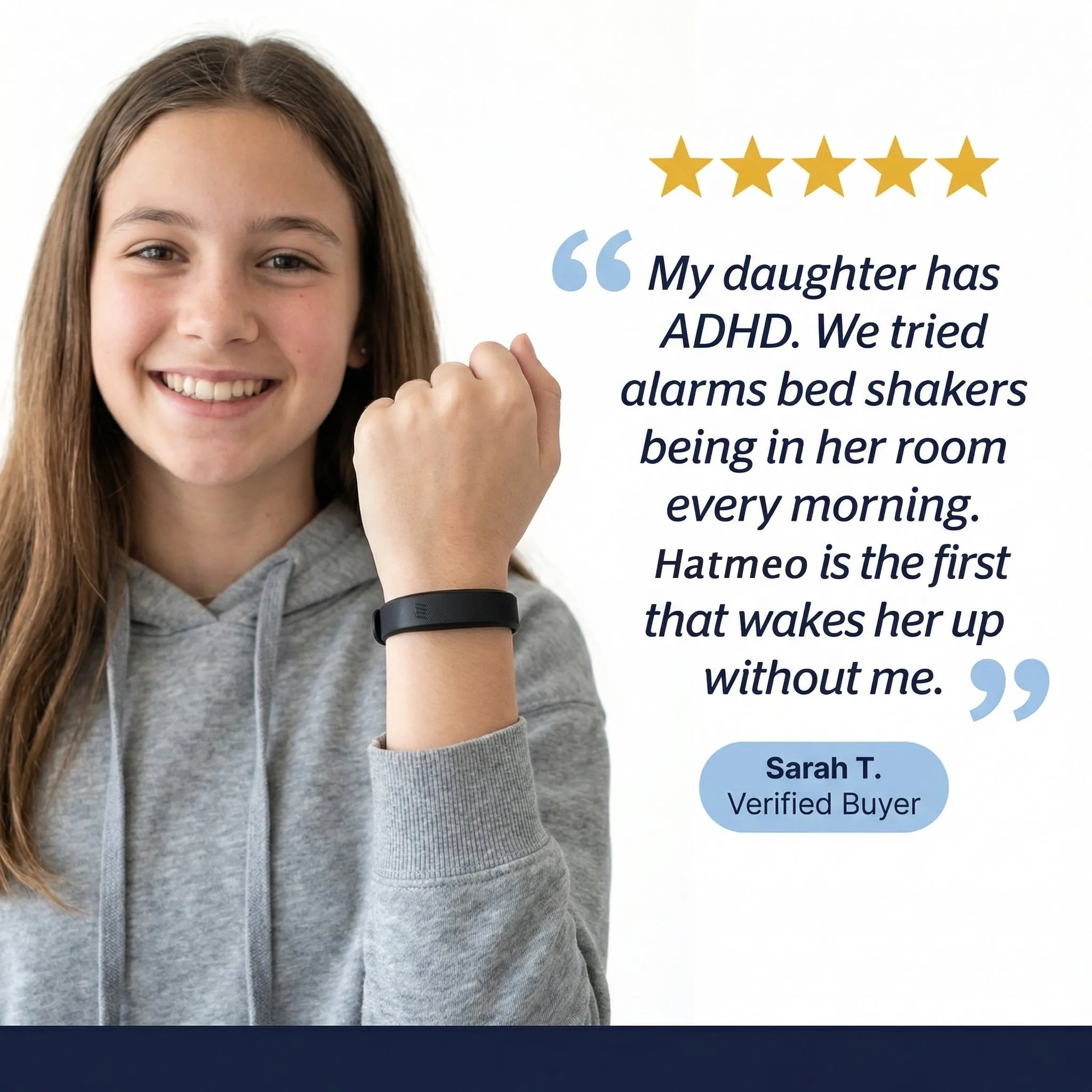 I have hearing loss and traditional alarms were just not reliable for me. The Hatmeo band has given me so much more independence in the morning.